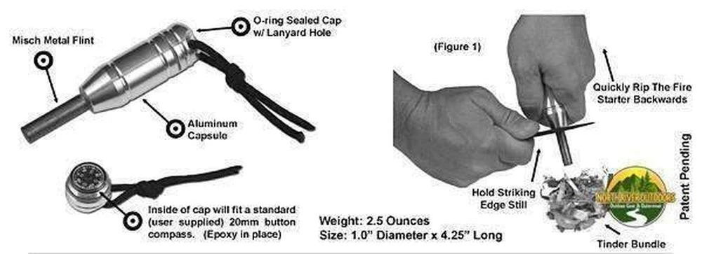 The Fire Kit can be clipped to a belt or vest, carried in your pack or put in the glove box of your vehicle. The compact size and light weight make this kit a very unique survival tool for hikers, adventurers, campers, hunters or anyone else who ventures into the wilds. The ESEE Fire Kit uses a removable / replaceable Misch Metal flint. It does not produce a shower of sparks like standard Ferro rods. When struck with a sharp edge, the Misch Metal flint produces small balls of molten particles that burn hotter and have a longer burn time than the sparks made by a standard fire flint. This rod has been proven to light difficult tinder that regular flint wonβt, thus the reason for using this type of flint in a βlast-ditchβ survival kit. The Misch Metal flint requires a very sharp edge to strike. We suggest using the edge of your knife as a striker. This kit is a real survival tool, and in a true survival situation it wonβt matter if you dull a small part of your knifeβs edge in exchange for building a life-sustaining fire.
