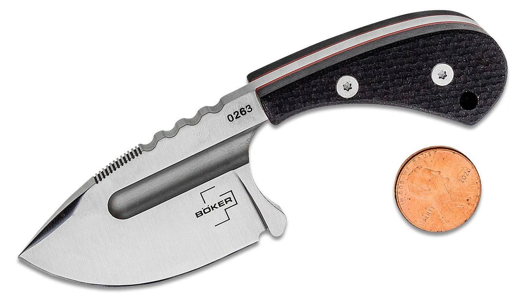 The extremely handy Boker Plus Sigyn is a lightweight neck knife designed by Midgard Knives and, like the previous models of Midgards knives, can be equipped with different handle scales. Using a standard 3D printer, these can be easily printed out by yourself in a wide variety of shapes, colors, and materials. The compact three-finger knife comes with an ergonomically shaped handle made of durable G10. The finely textured handle scales lie securely in the hand even when wet and are also provided with a red fiber layer. Jimping in the area of the thumb rest further increase work safety. The satin-finished drop point blade is made of D2 and is equipped with a decorative groove. The knife comes with a lanyard hole, ball chain, and custom-fit Kydex sheath.
