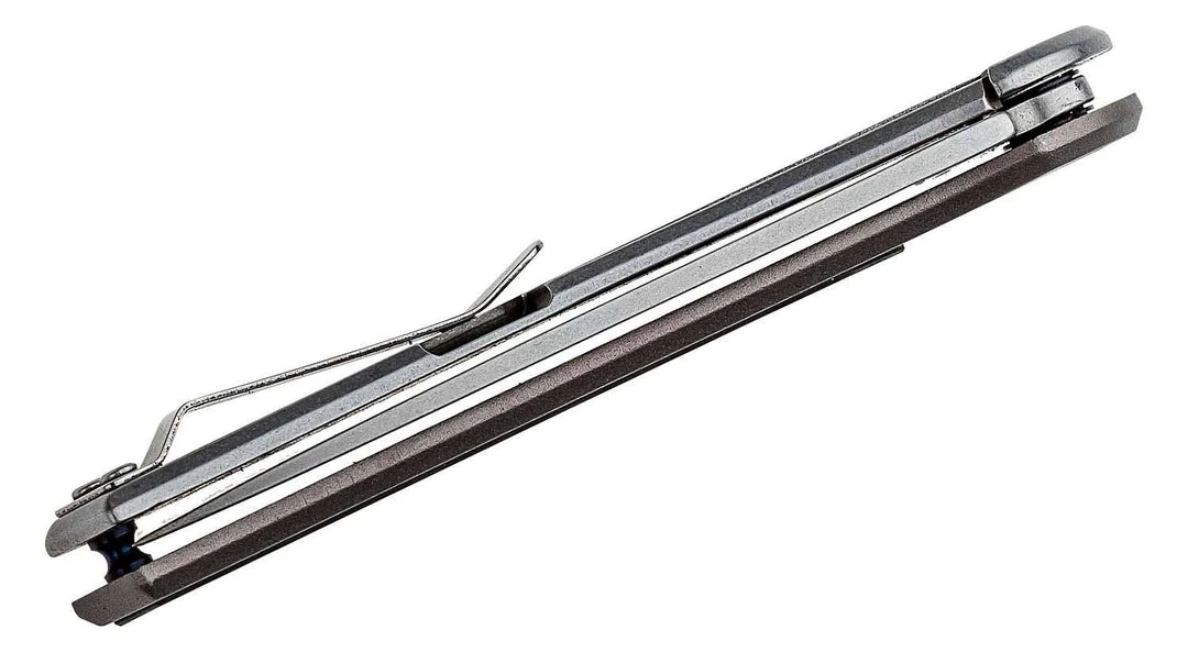 A sleek, frame lock folder that is the perfect choice for everyday carry. The 264 Cavalier features a gray anodized aluminum handle with a carbon fiber inlay and a blue fastener. This slim knife utilizes ball bearing technology and a blade flipper for a smooth, seamless opening. A stonewashed finish, stainless steel pocket clip adds carry convenience.