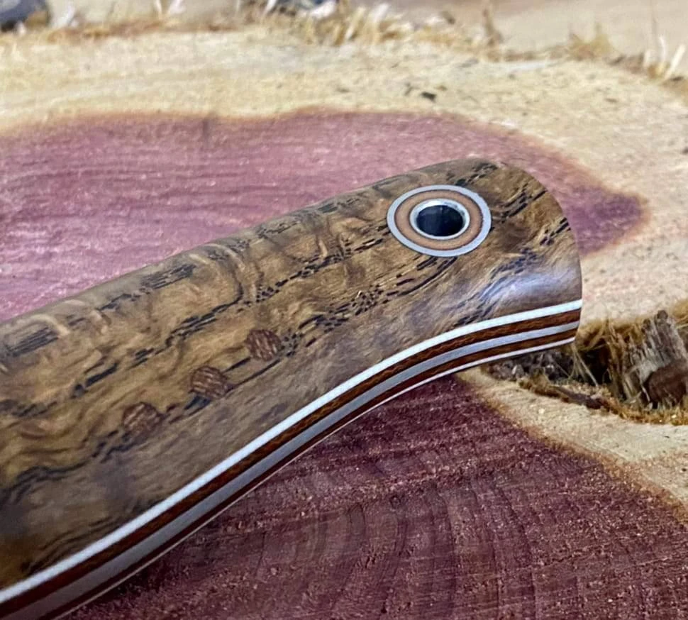 Fiddleback Forge Bushcrafter 4″ Blade w/Β Dyed Curly Ash Handles and 8670 Blade Steel (Custom)