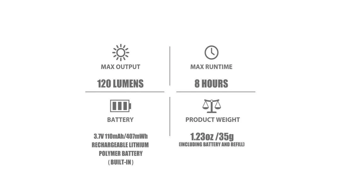 - With a built-in 110mAh rechargeable lithium-polymer battery, the light can run up to 8 hours and be fully charged in less than one hour.
