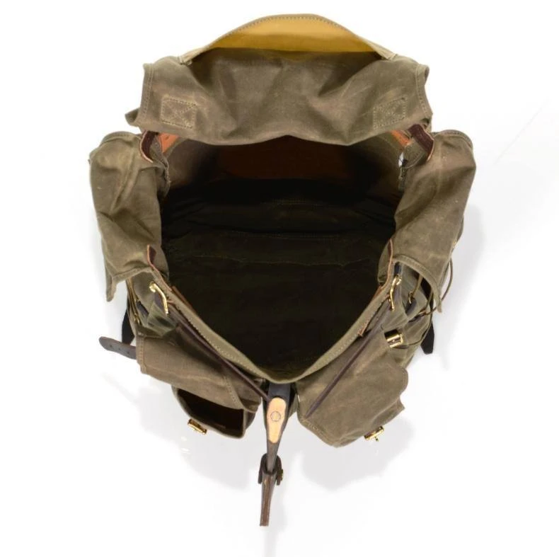 | MATERIALS | 18 oz. waxed canvas, premium leather, solid brass hardware. |