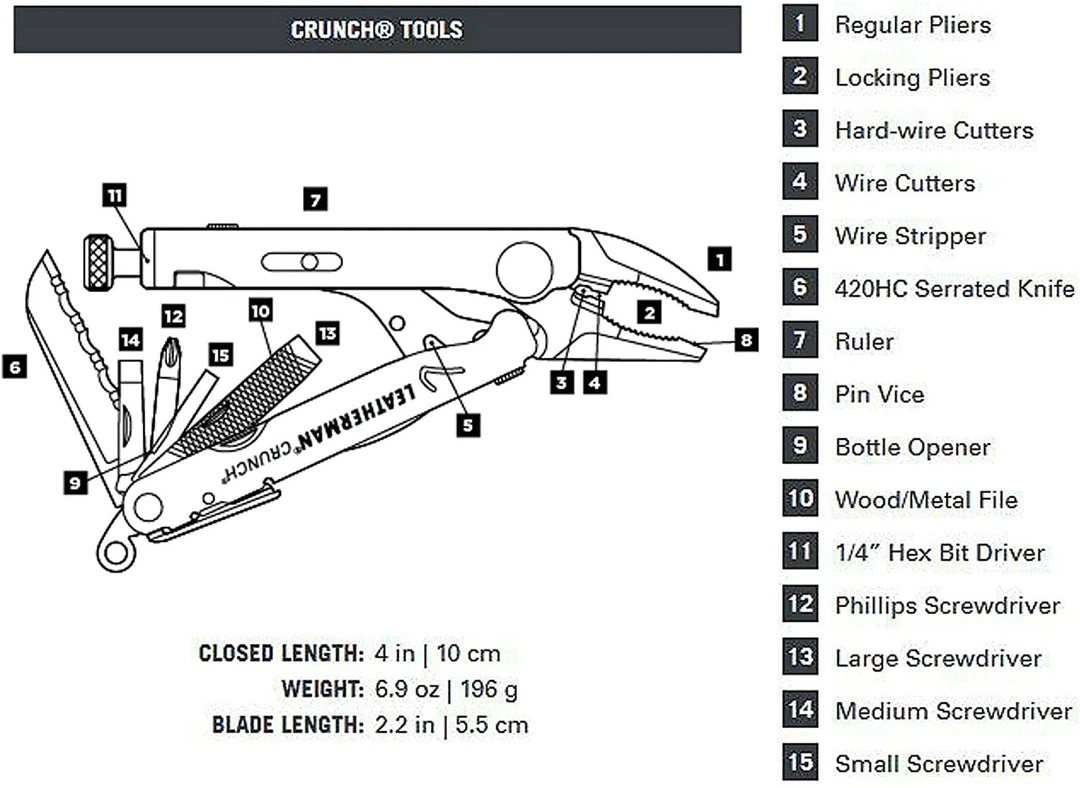 Made for the most demanding professionals and do-it-yourselfers, Leathermans Crunch multi-purpose tool features locking pliers that spread wide enough to clamp a 1-inch pipe, but it folds up into a tidy 4-inch, 6-ounce package for convenient storage in a pocket or bag. Remove the adjusting screw and you’ll find a 1/4-inch hex-bit adapter built right in. The pliers lock into position like vise grips, leaving both hands free for other work, and all the interior blades lock too, for optimal safety and power.