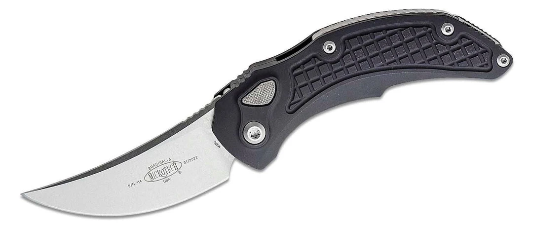 The Brachial is a Persian-style design collaboration with Bastinelli Knives bringing a uniquely styled piece to the Microtech lineup. We love everything about this knife. From its look to its ergonomics, industry-leading action, and materials; it will serve you well for years to come. It’s also suited for a myriad of applications ranging from EDC to tactical and literally everything in-between. Includes a frag-pattern machined finish for additional grip, an excellently designed pocket clip, and a hidden lanyard slot that will accommodate 550 paracord. This is one heck of a knife, get it while you can!