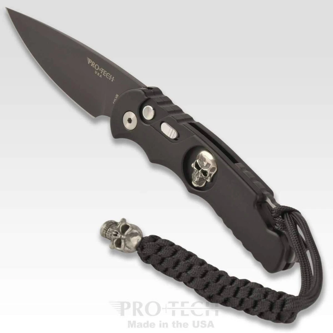 Protech TR-5.70 Skull Limited Edition Knife has a sterling silver skull carved by Bruce Shaw and inlaid into the black aluminum handles and a black DLC coated s35vn blade β limited to 300 made!