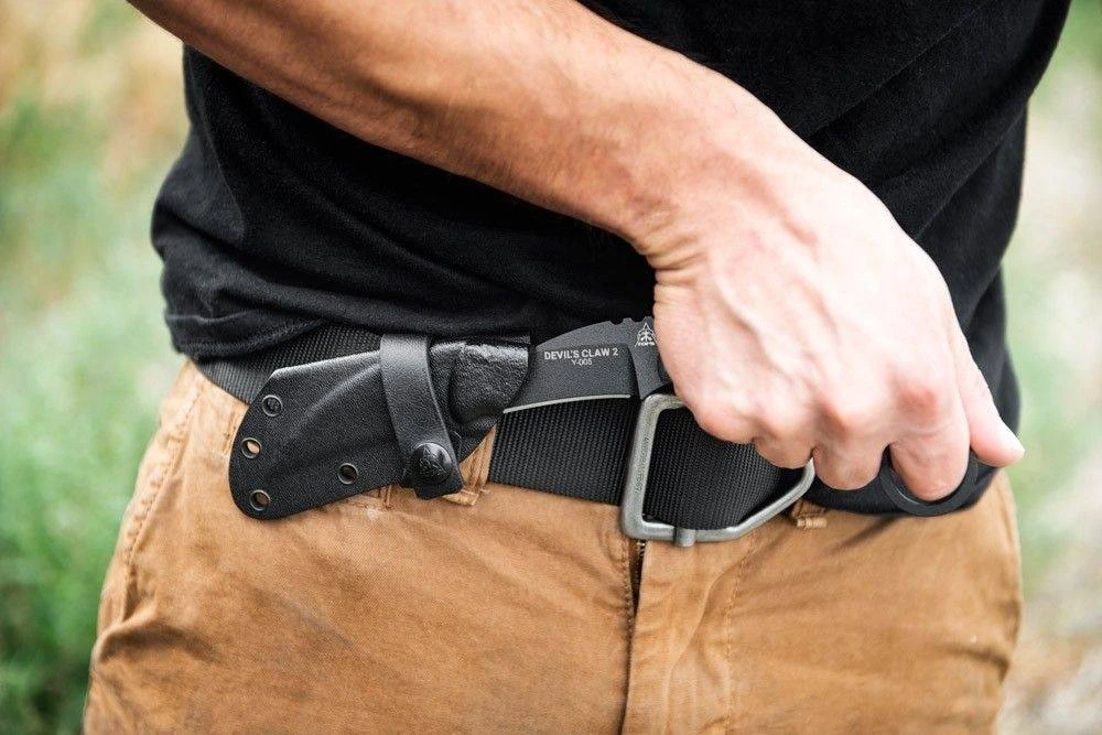 The blade shape, materials, and thicknesses are the same on the Devil’s Claw 2 as those from the original. The hawkbill blade shape is a proven design for utility and defense tactics. It bites deep on pulling cuts and on slashes. So whether you’re using it for self-defense or opening boxes, it’ll do the job quick and easy. The only real update between this and the original is that the handle has been extended to fit the user’s full hand and the ring added to the pommel as is found on karambits the world over. The longer handle with the ring on the end provides the user with options that arenβt available with the original version (just remember the trade-off is that the new version is slightly more difficult to conceal).