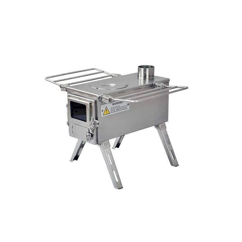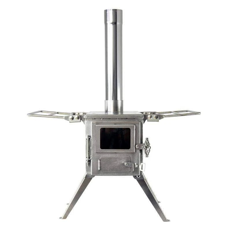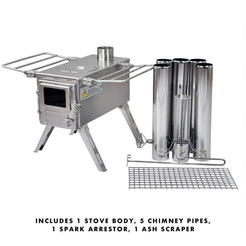 - Highly portable- Nesting legs and shelves fold flat to the stove body; 5 pipe sections, spark arrestor, and an ash scraper stow inside the stove body
