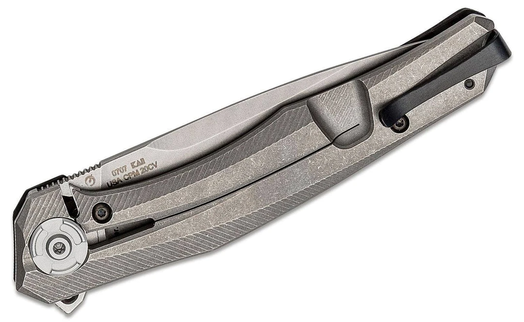- CPM-20CV blade steel offers exceptional hardness, wear resistance, edge retention; stonewashed finish helps hide use scratches